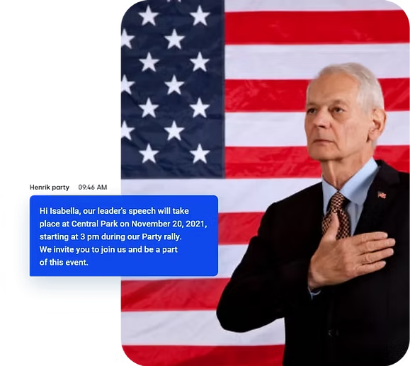 SMS is ideal for inviting supporters to rallies, town halls, and canvassing events. Campaigns can also use political sms marketing to recruit, organize, and coordinate volunteers, sending updates and instructions instantly. - Fundraising Appeals and Donation Links: